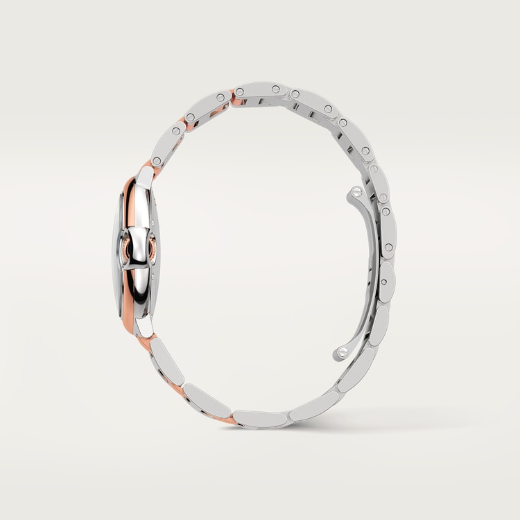 Ballon Bleu de Cartier saat, 33 mm, kendinden kurmalı mekanik mekanizma. Çelik kasa, pembe altın 750/1000 çerçeve, sentetik kabaşon spinelle set edilmiş yivli pembe altın 750/1000 kurma kolu. Güneş ışını efektli 12 bölgeli gümüş rengi flinqué guilloché kadran. Mavi çelik kılıç şeklinde ibreler. Safir kristal. Ortasında pembe altın 750/1000 baklalar olan çelik bilezik. Bilek ölçüsü: 170 mm. Kasa kalınlığı: 10 mm. 3 bar’a kadar (yaklaşık 30 metreye/100 fite kadar) suya dayanıklı.