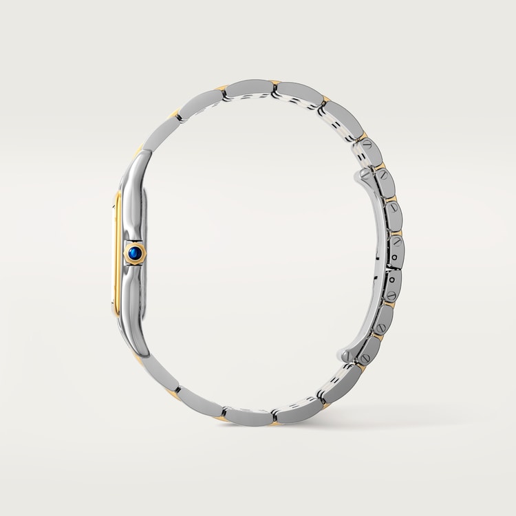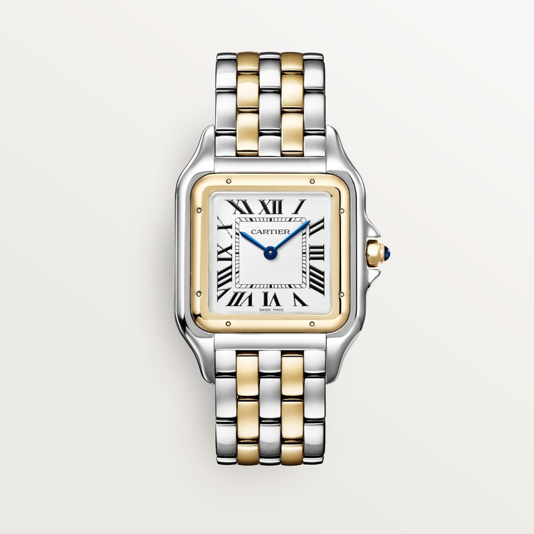 Panthère de Cartier saat, büyük model, quartz mekanizma. Sarı altın 750/1000 ve çelik kasa, boyutlar: 31 mm x 42 mm, kalınlık: 6,71 mm, mavi sentetik spinelli kurma kolu, gümüş rengi kadran, mavileştirilmiş çelikten kılıç şeklinde ibreler, sarı altın 750/1000 ve çelik bilezik. 3 bar’a (yaklaşık 30 metre) kadar suya dayanıklı.