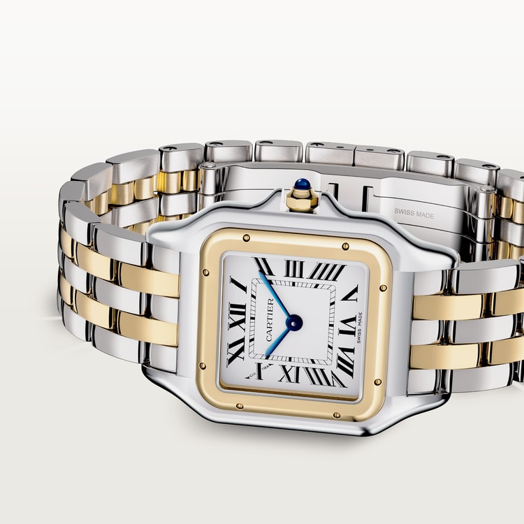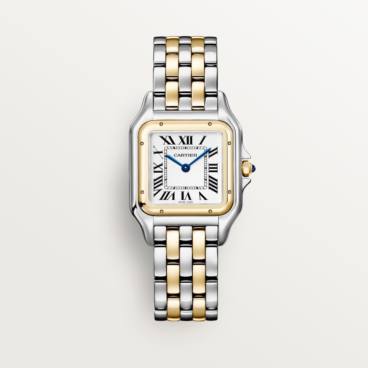 Panthère de Cartier kol saati, orta model, kuvars mekanizma. Sarı altın 750/1000 ve çelik kasa, boyutlar: 29 mm x 37 mm, kalınlık: 6 mm, sentetik mavi spinelle set edilmiş kurma kolu, gümüş rengi kadran, mavileştirilmiş çelikten kılıç şeklinde ibreler, sarı altın 750/1000 ve çelik bilezik. 3 bar’a kadar (yaklaşık 30 metreye kadar) suya dayanıklı.