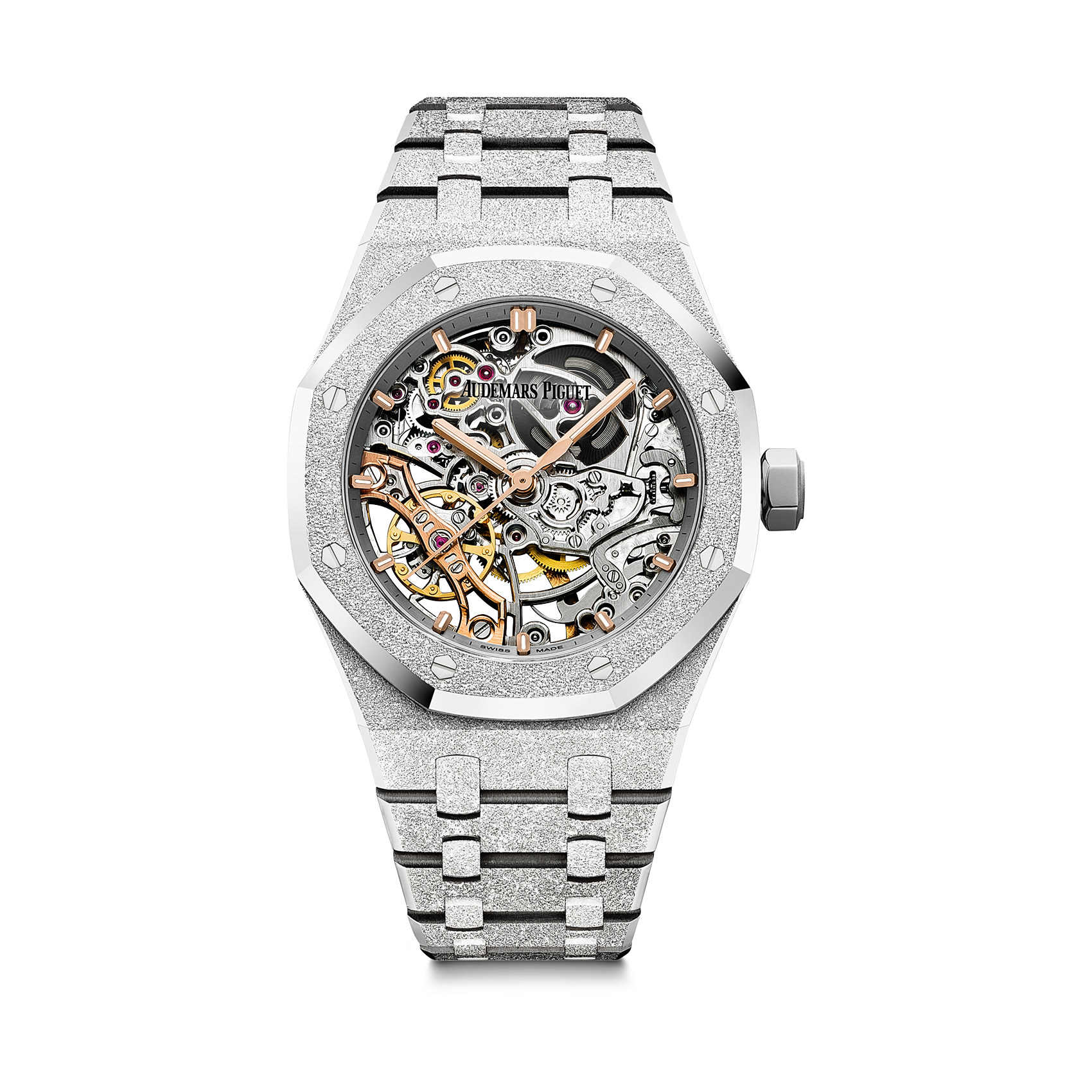 DIALOpenworked rhodium-toned dial, pink gold applied hour-markers and Royal Oak hands with luminescent coating.