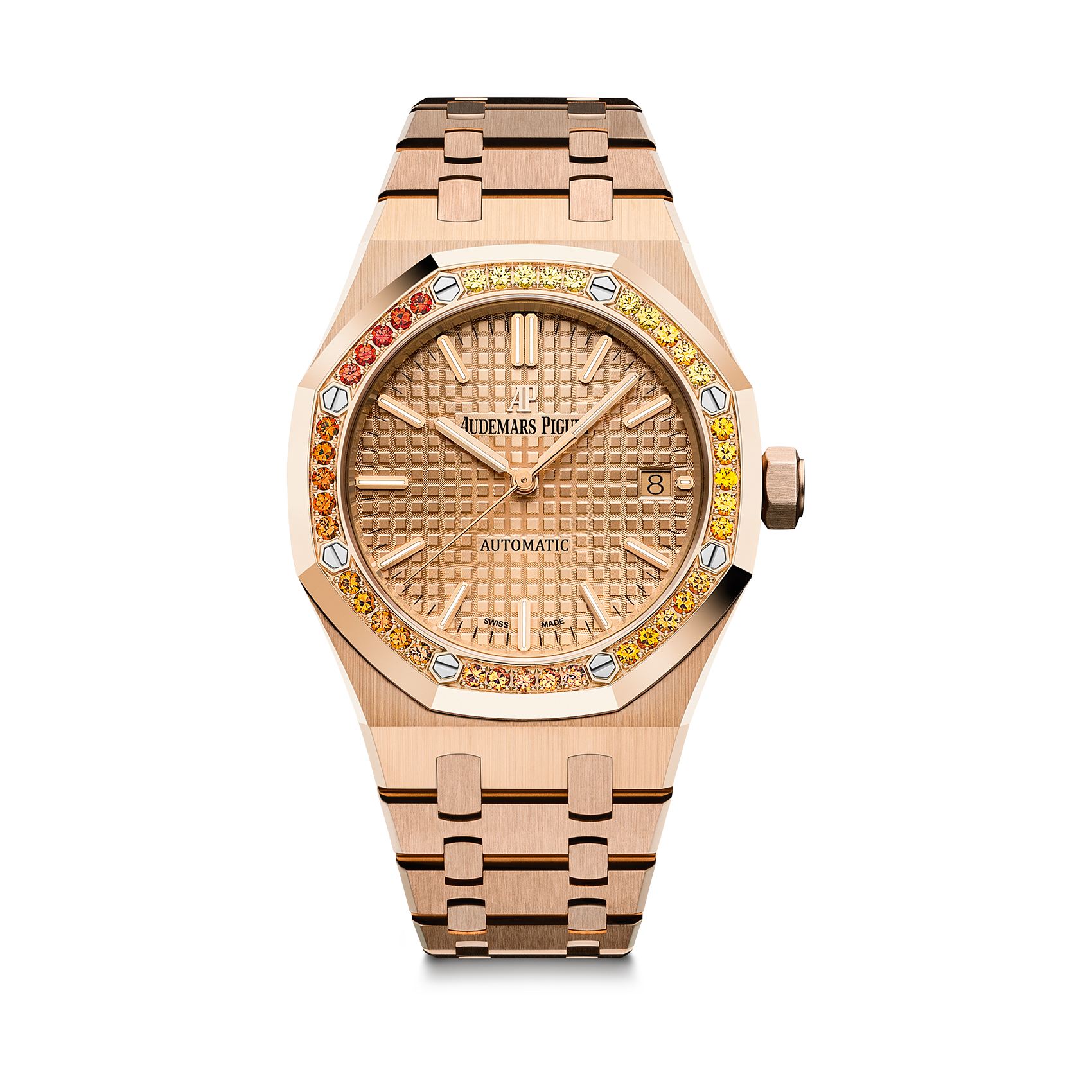 DIALPink gold-toned dial with “Grande Tapisserie” pattern, pink gold applied hour-markers and Royal Oak hands with luminescent coating.