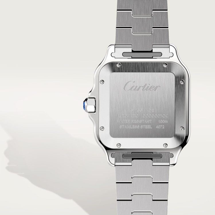 Santos saat, büyük model, otomatik kurmalı mekanik mekanizma, kalibre 1847 MC. Çelik kasa ve sarı altın 750/1000 çerçeve, fasetli bir sentetik spinelle set edilmiş 7 kenarlı kurma kolu, gümüş rengi opalin kadran, mavileştirilmiş çelikten kılıç şeklinde ibreler, safir kristal. “SmartLink” ayar sistemli çelik bilezik. Değiştirilebilir katlanan çelik tokalı dana derisinden ikinci bilezik. Her iki bilezik de “QuickSwitch” değiştirme sistemine sahiptir. Kasa genişliği: 39,8 mm, kalınlık: 9,38 mm. 10 bar’a kadar (yaklaşık 100 metreye/100 fite kadar) suya dayanıklı.