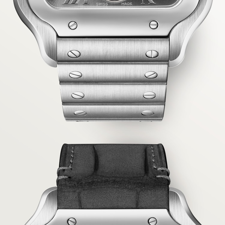 Santos de Cartier Dual Time saat, büyük model, mekanik mekanizma, çift zaman dilimi. Çelik kasa, fasetli sentetik mavi spinelli 7 kenarlı kurma kolu, saten kaplama antrasit gri gün ışını fırçalı kadran, sayaç içinde ek bir saat ibresi ve gündüz/gece göstergesi ile ikinci saat dilimi göstergesi. Parlayan materyalden rodyum finisajlı cilalı çelikten kılıç şeklinde ibreler, safir kristal. SmartLink ayar sistemli çelik bilezik. Gri timsah derisinden ikinci kayış, çelikten değiştirilebilir katlanır toka. Her ikisi de QuickSwitch değiştirme sistemine sahiptir. Kasa genişliği: 40,2 mm, kalınlık: 10,1 mm. 10 bar’a (yaklaşık 100 metre) kadar suya dayanıklı.