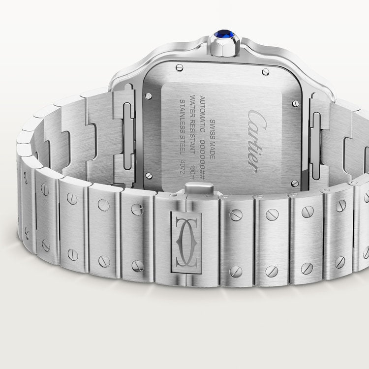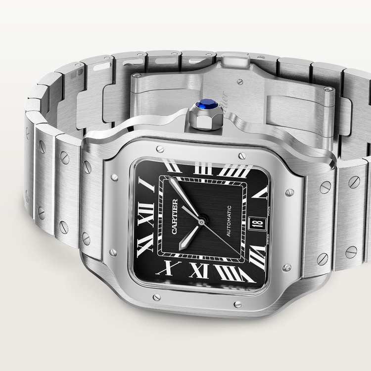 Santos saat, büyük model, otomatik kurmalı mekanik mekanizma, 1847 MC. Çelik kasa, fasetli bir sentetik spinelle set edilmiş 7 kenarlı kurma kolu, siyah kadran, siyah çelikten kılıç şeklinde ibreler, ışıklı materyal, safir kristal. “SmartLink” ayar sistemli çelik bilezik. İkinci kayış nubuk timsah derisi, değiştirilebilen çelik katlanır toka. Her ikisi de “QuickSwitch” değiştirilebilir sisteme sahiptir. Boyutlar: 47 x 39,8 mm. Kalınlık: 9,4 mm. 10 bar’a (yaklaşık 100 metre) kadar suya dayanıklı.