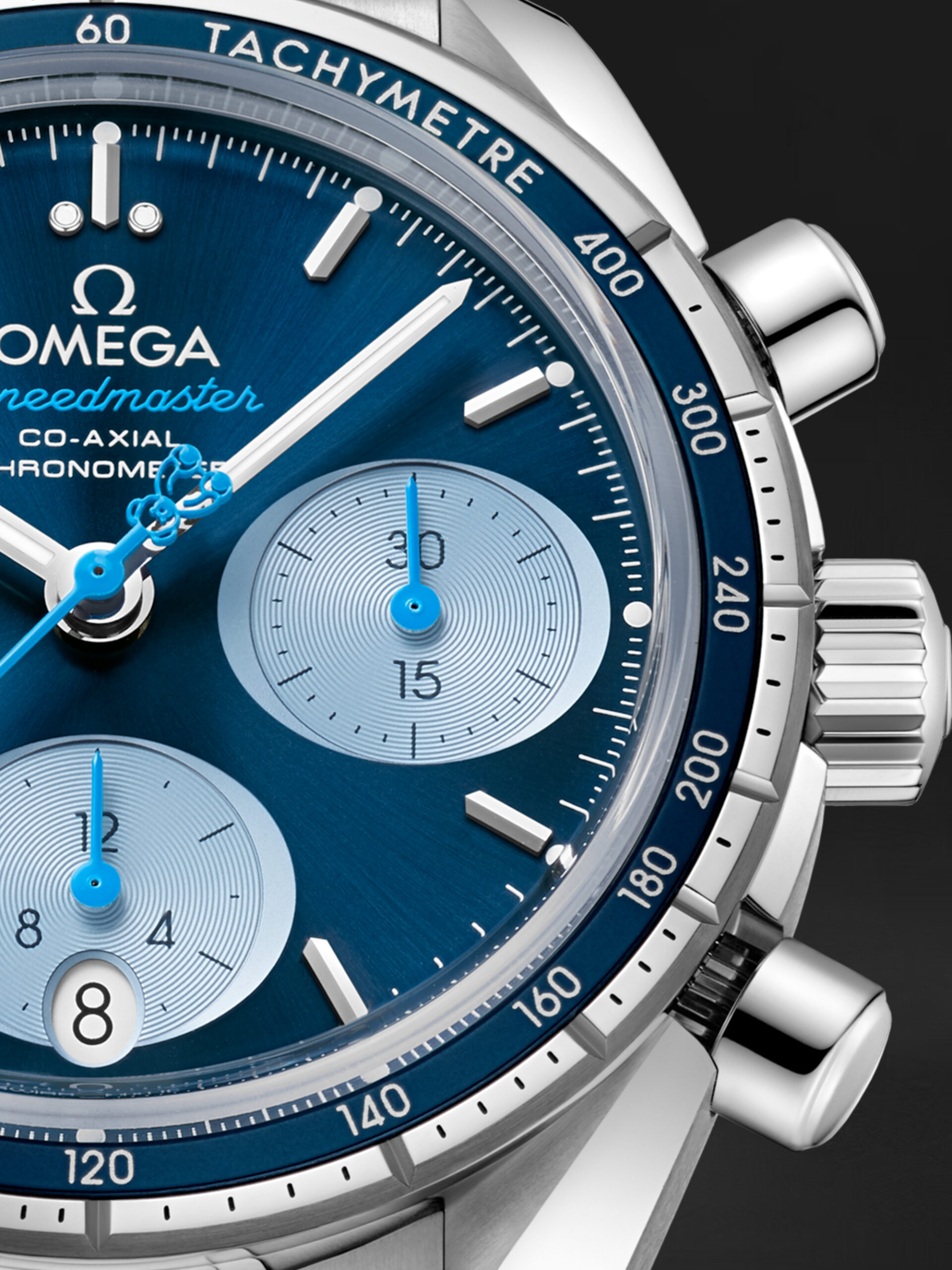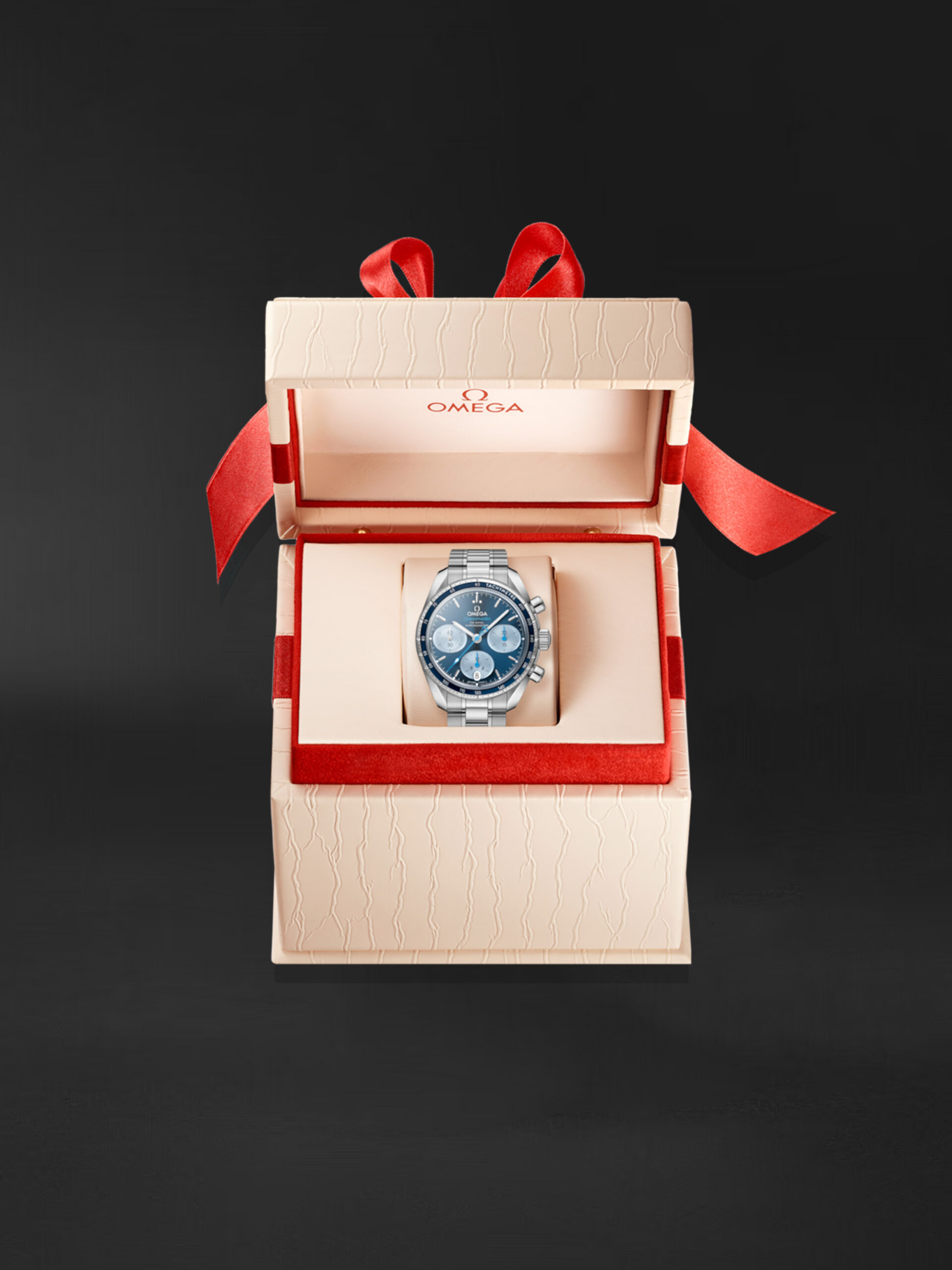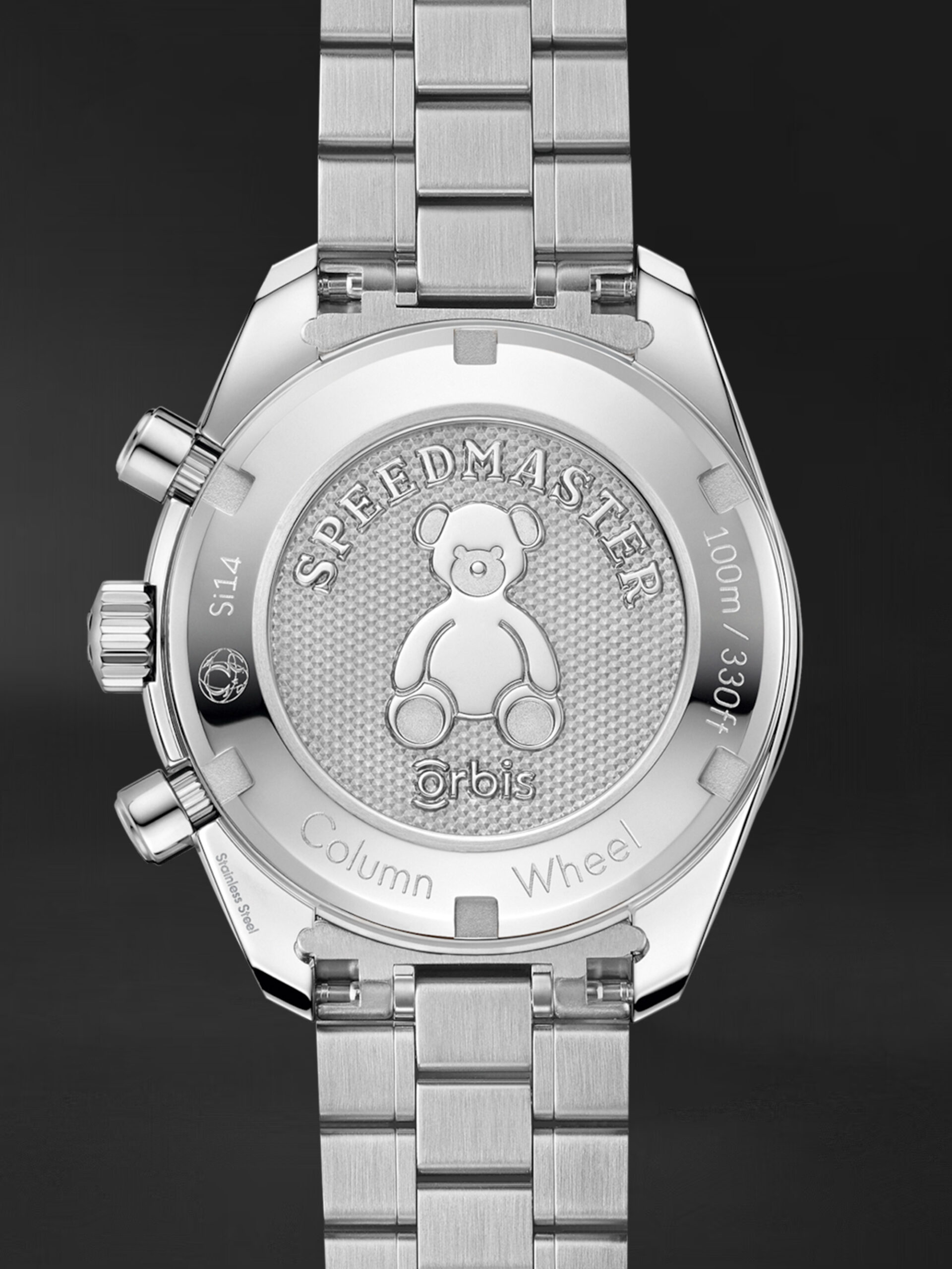 Omega Speedmaster 38 mm, Orbis International ve Flying Eye Hastanesi tarafından sağlanan kritik göz bakımının güzel bir kutlaması haline getiren bir dizi ayırt edici unsurla karakterize edilir. Saat, paslanmaz çelik bir kasaya ve mavi alüminyum halka üzerinde takimetre ölçekli çerçeveye sahiptir. Güneşten fırçalanmış mavi kadran, yatay, açık mavi oval alt kadranlar ve saat 6 konumunda dikey bir oval tarih penceresi içerir. İndeksler rodyum kaplamadır, ibreler de rodyum kaplama veya mavidir. Mavi merkezi saniye ibresi, özel bir Orbis Teddy Bear karşı ağırlığı içerir.Referans: 32430385003002