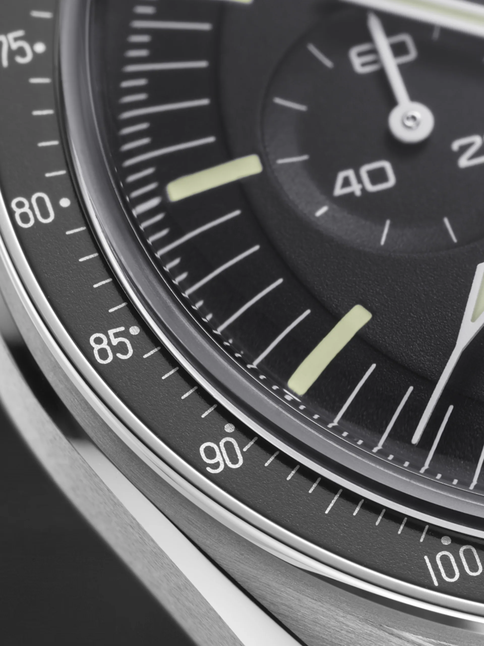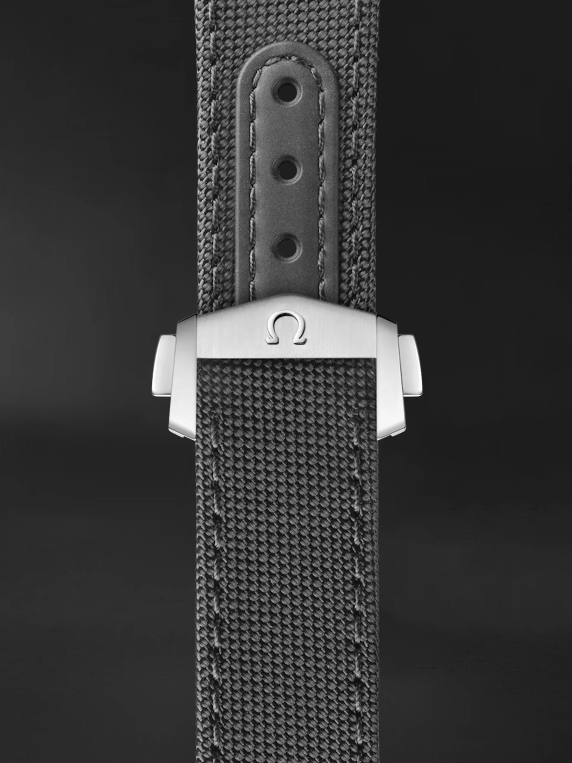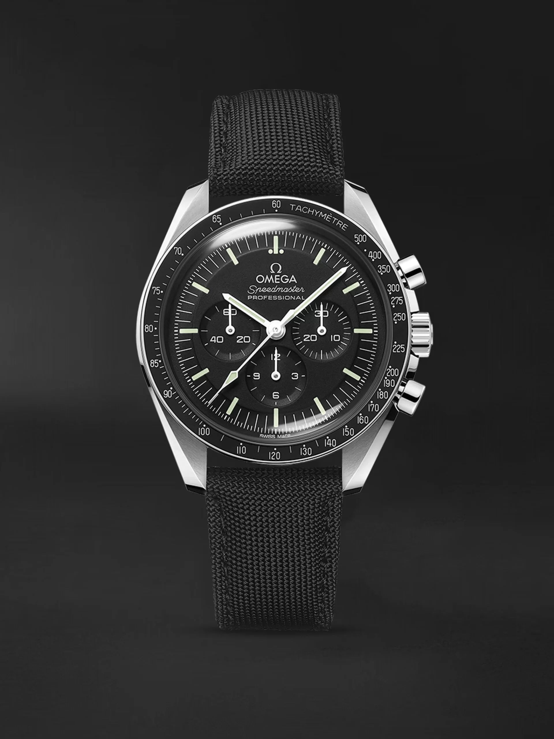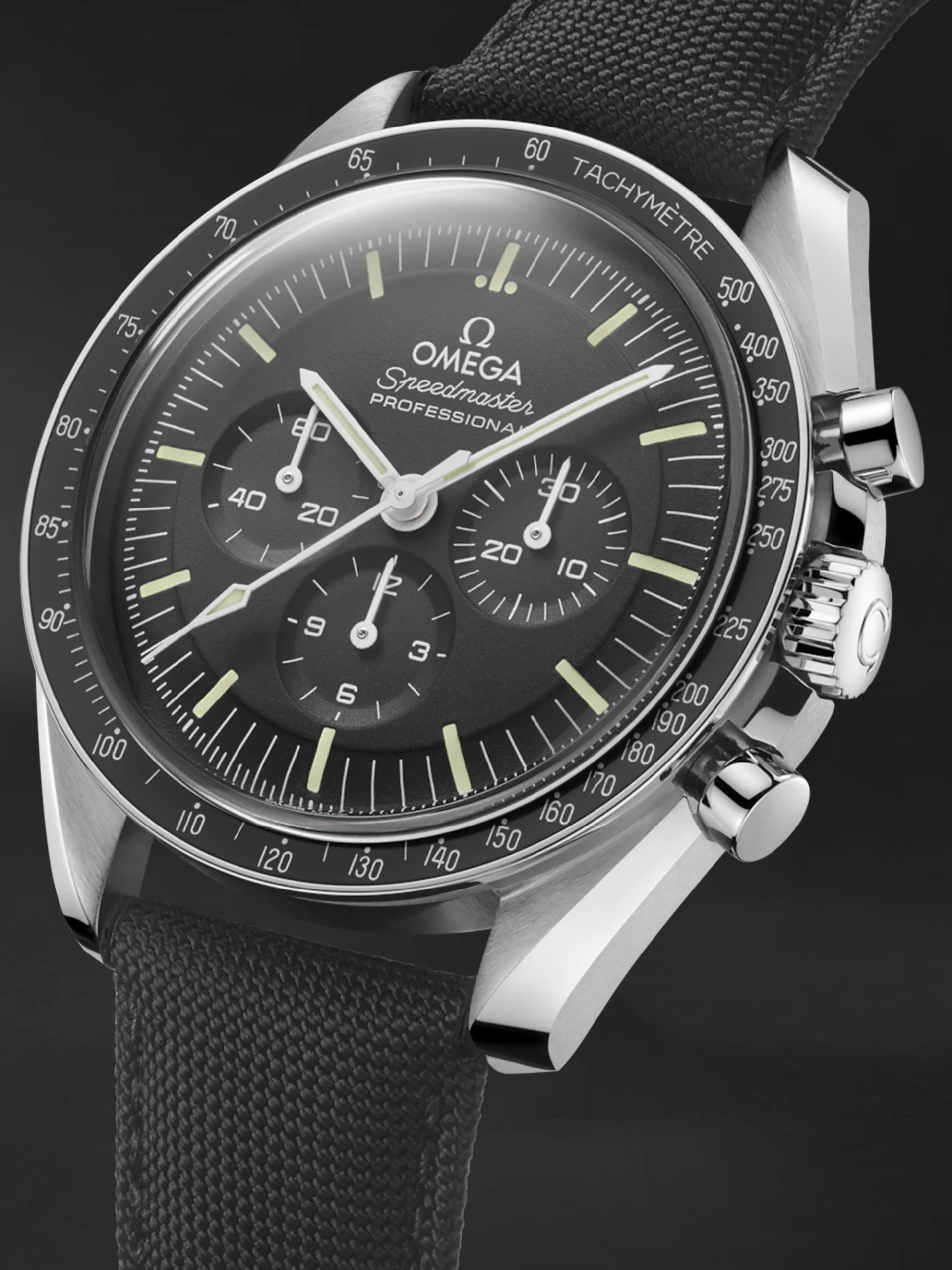 Speedmaster Moonwatch, dünyanın en ikonik saatlerinden biridir. Altı aya inişin bir parçası olan efsanevi kronograf, markanın maceracı öncü ruhunun etkileyici bir temsilidir. Naylon kumaş kayış üzerinde sunulan bu 42 mm paslanmaz çelik Ay Saati’nin önünde hesalit cam ve kasasının arkasında kabartmalı bir Denizatı madalyonu bulunur. Ay’da giyilen 4. nesil Speedmaster stilinden ilham alan bu modelde ayrıca asimetrik bir kasa, siyah kademeli kadran ve eloksallı alüminyum çerçeve halkasında 90’ın üzerindeki ünlü nokta bulunur. Referans: 31032425001001