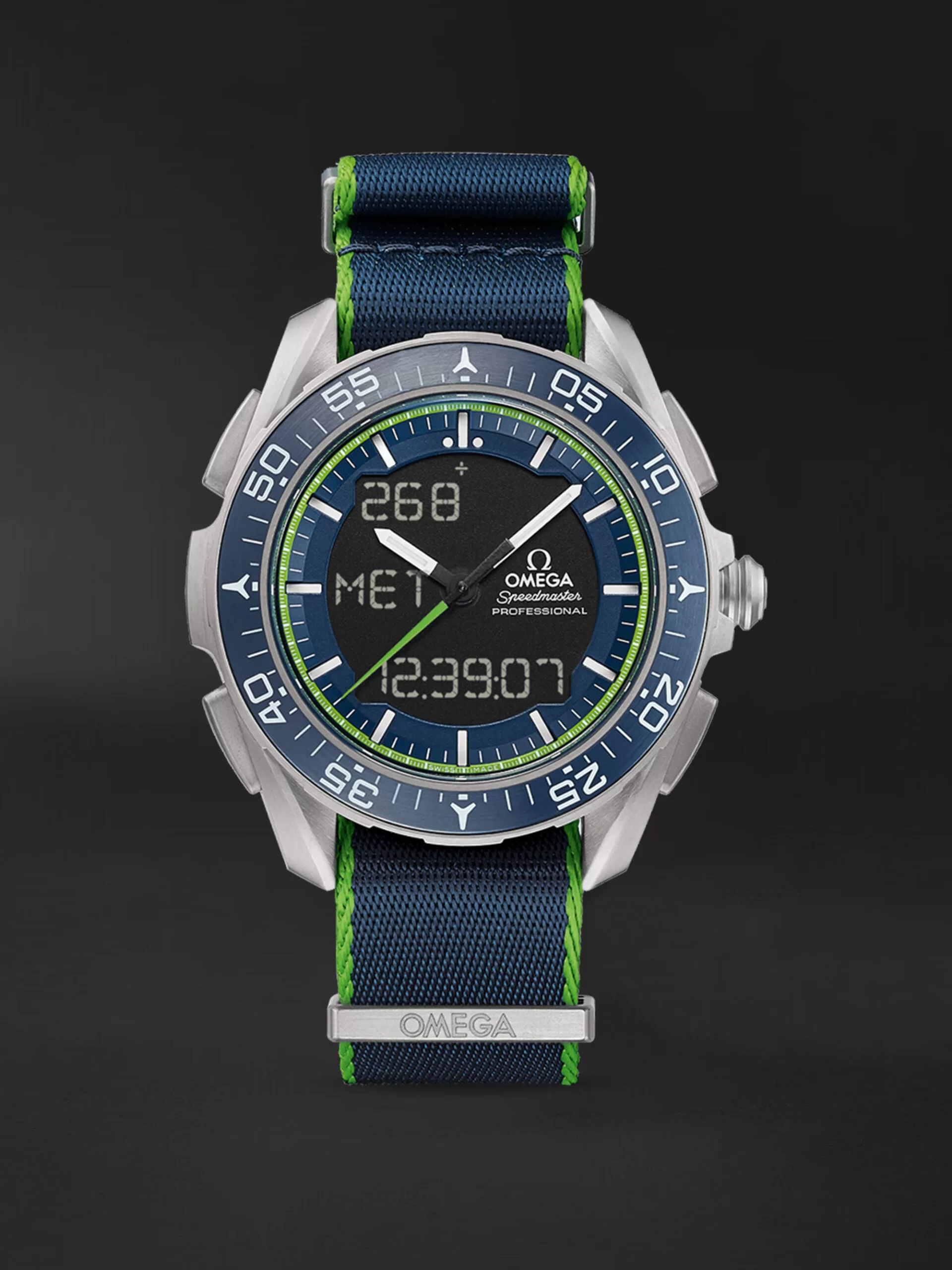 Speedmaster Skywalker X-33 Solar Impulse Liimitli Üretim olağanüstü bir saatten daha fazlasıdır. Sadece güneş enerjisiyle çalışan bir uçakla dünyanın çevresini dolaşmak için iddialı bir projenin kutlanmasıdır.Beyaz transfer indeksleri ve beyaz Super-LumiNova ile kaplanmış saat imleri ile mavi ve yeşil kadran, kullanıcının likit kristal ekran dijital öğelerini okumasını sağlayan merkezi bir açıklığa sahiptir. 2. derece titanyum Speedmaster Skywalker X-33 Solar Impulse Limited Edition, çok işlevli kuvars kronograf hareketi OMEGA kalibre 5619 ile çalışır. Referans: 31892457903001