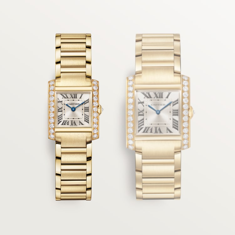 Tank Française saat, küçük model, quartz mekanizma. Toplam 0,78 karat 23 adet yuvarlak kesim pırlanta yerleştirilmiş sarı altın (750/1000 ) kasa ve fasetli kurma kolu. Altın güneş ışını kadran, mavileştirilmiş çelikten kılıç şeklinde ibreler, safir kristal. Bilezik, sarı altın 750/1000. Kasa boyutları: 25,7 mm x 21,2 mm, kalınlık: 6,8 mm. 3 bar’a kadar (yaklaşık 30 metreye/100 fite kadar) suya dayanıklı.